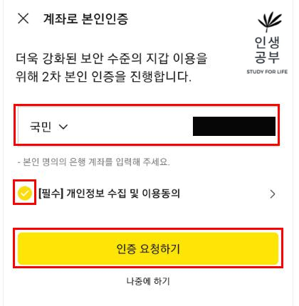 본인을 인증하는 항목이 차례대로 나오면 인증해준 후, 마지막에 계좌로 본인 인증을 해주셔야합니다. 보안정책상 앞에 2가지 인증 과정은 캡쳐하지 못했으나 차례대로 화면에 뜬 방법대로 인증하시면 됩니다.