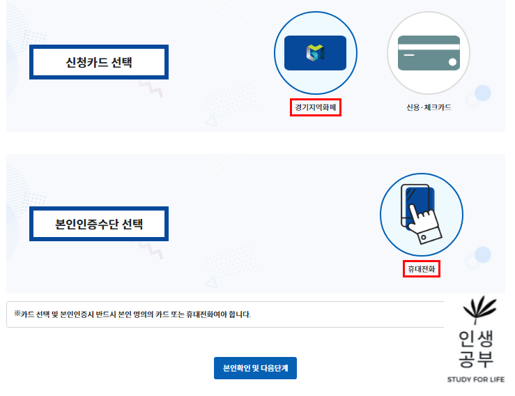 신청카드를 선택하고, 본인인증 수단을 선택하는 항목이 있네요. 저는 더이상 진행할 수 없어서 오늘은 여기까지 진행하고 내일 더 진행하기로 했습니다. 1시간 넘게 기다려서 아쉽지만 제대로 확인하지 못한 제 잘못이라고 생각해서 다음번에는 꼭 제대로 읽어보고 진행해야겠다고 생각했습니다.