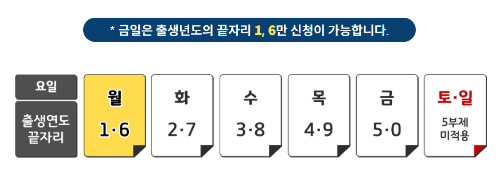 요일에 따라서 출생연도 끝자리에 맞춰서 신청할 수 있습니다. 저는 화요일에 신청할 수 있는데, 5부제가 시행되는지 모르고 있다가 월요일에 신청하려고 한참 기다렸는데 결국 못했습니다. 가슴아프지만 화요일과 토요일, 일요일을 기약해야겠습니다.
