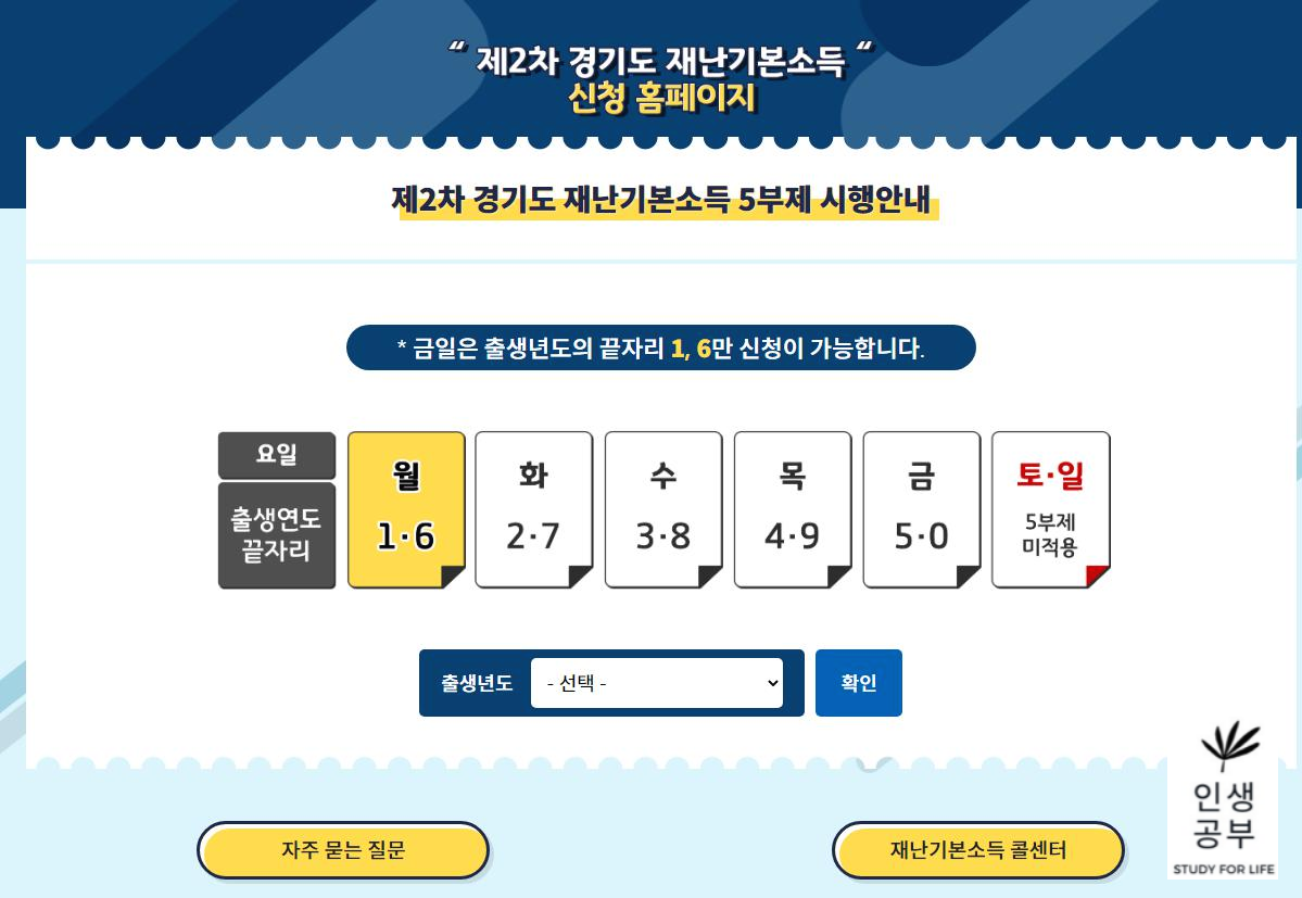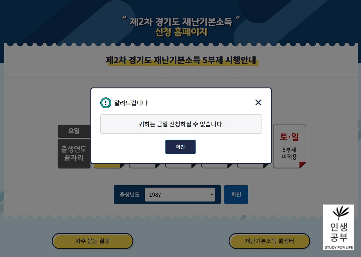 경기도 재난기본소득 5부제 시행으로 끝자리가 7인 저는 월요일이라서 하지 못하고 화요일날 해야했습니다. 혹시몰라서 출생연도를 선택한 후, 확인 버튼을 눌러보았습니다.