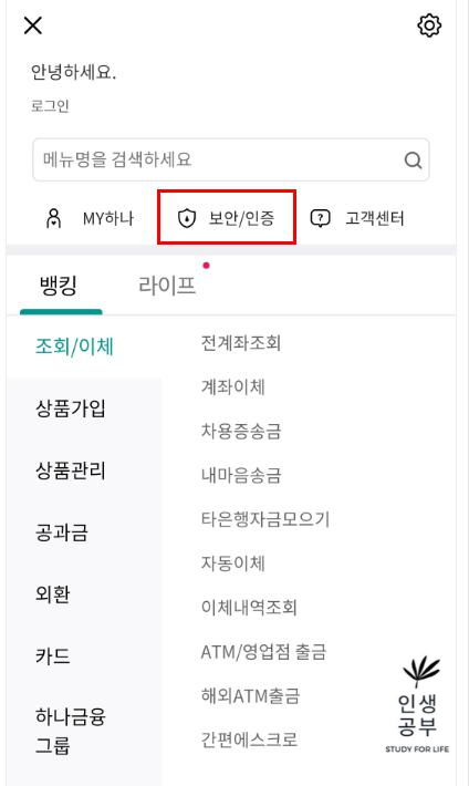 보안/인증 버튼을 눌러주세요.