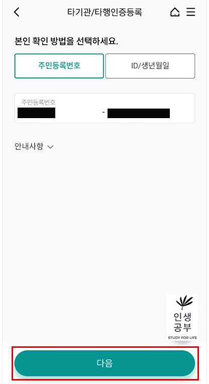 주민등록번호를 적은 후, 하단에 다음 버튼을 눌러주세요.
