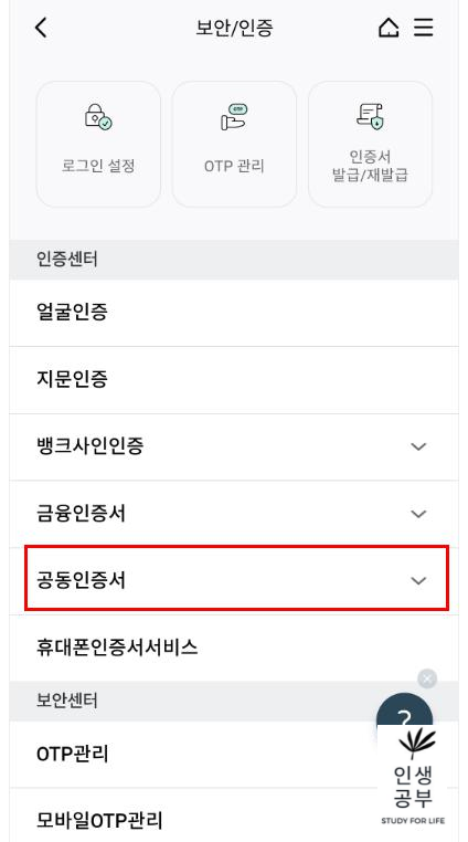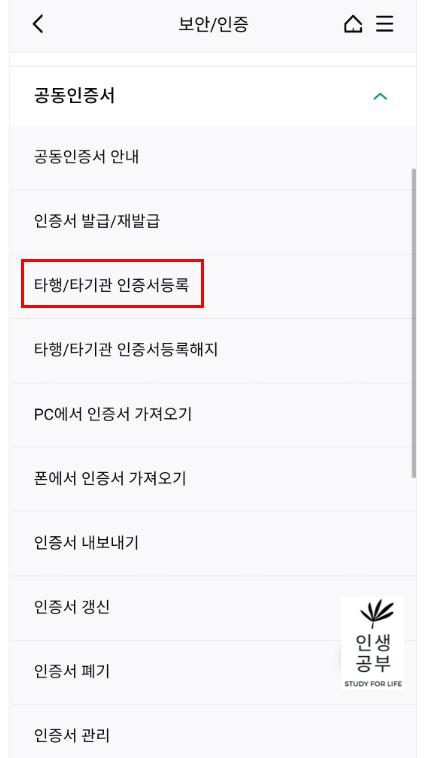 공동인증서 메뉴에서 타행/타기관 인증서등록 메뉴를 눌러주세요.