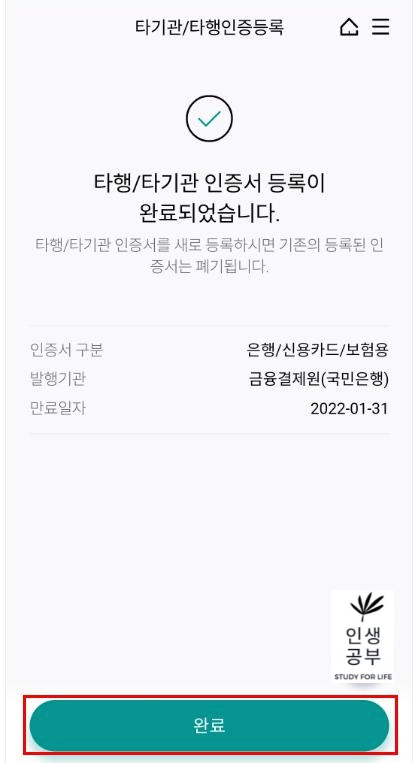 타행/타기관 인증서 등록이 완료되었습니다. 라는 안내창이 뜨면 정상적으로 타행 타기관 인증서 등록이 완료되었습니다. 이제 타행 인증서를 통해서 하나은행 업무를 볼 수 있습니다. 저 같은 경우는 KB국민은행 인증서를 등록했기 때문에 KB국민은행 인증서로 하나은행 업무를 볼 수 있게 되었습니다. 생각보다 어렵지 않게 쉽게 따라 할 수 있어서 좋네요.