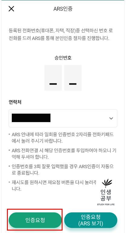 ARS인증의 경우 연락받을 연락처를 선택한 후, 하단에 있는 인증요청 버튼을 눌러주세요.