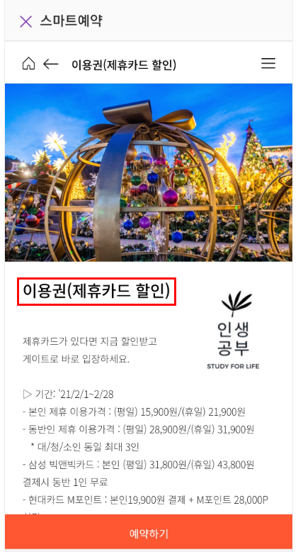 이용권을 제휴카드를 통해서 구매하면 본인 제휴 이용가격은 평일 15,900원이고 휴일은 21,900원이였습니다. 동반인 제휴 이용가격은 평일은 28.900원이고, 휴일은 31,900원이였습니다. 대인, 청소년, 소인 상관없이 최대 3인까지 해준다고 하니 할인 가격이 정말로 크더군요.